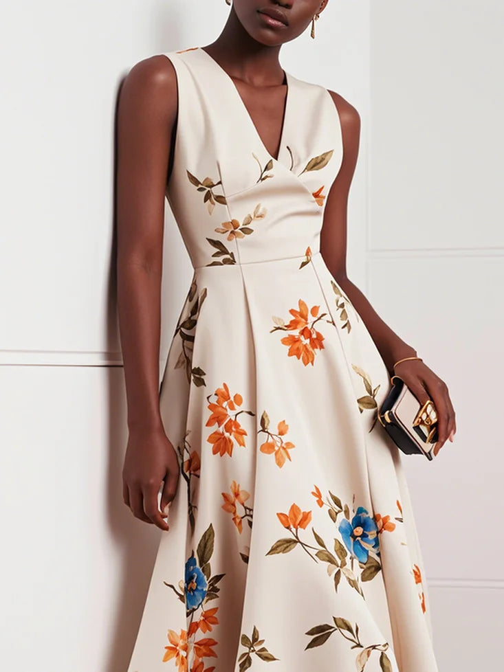 Beige Classic V Neck Floral Sleeveless A-Line Midi Dress