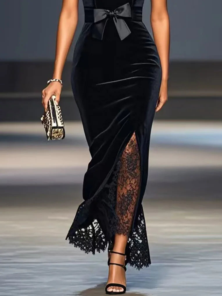 Black Lace Bow Sleeveless Mermaid Maxi Velvet Dress