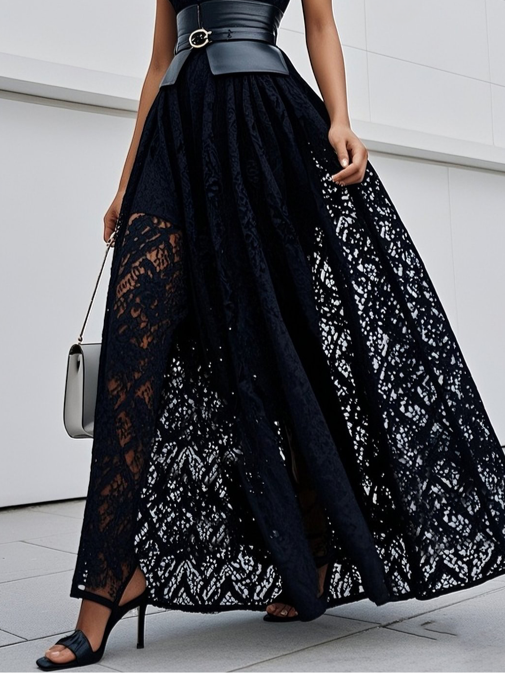 Black Lace Hollow Out Cotton Crew Neck Sleeveless A-Line Maxi Dress With Belt