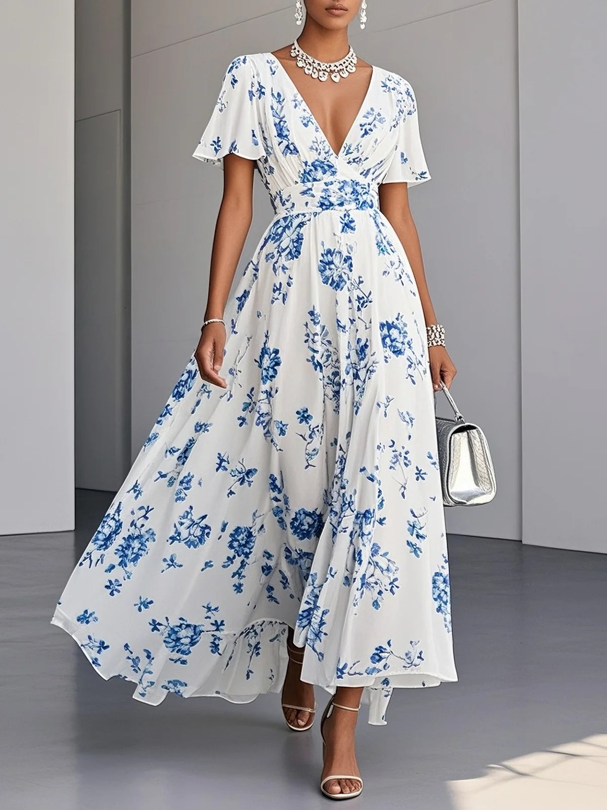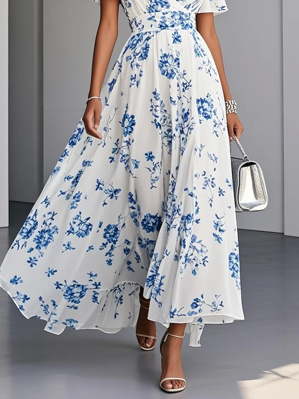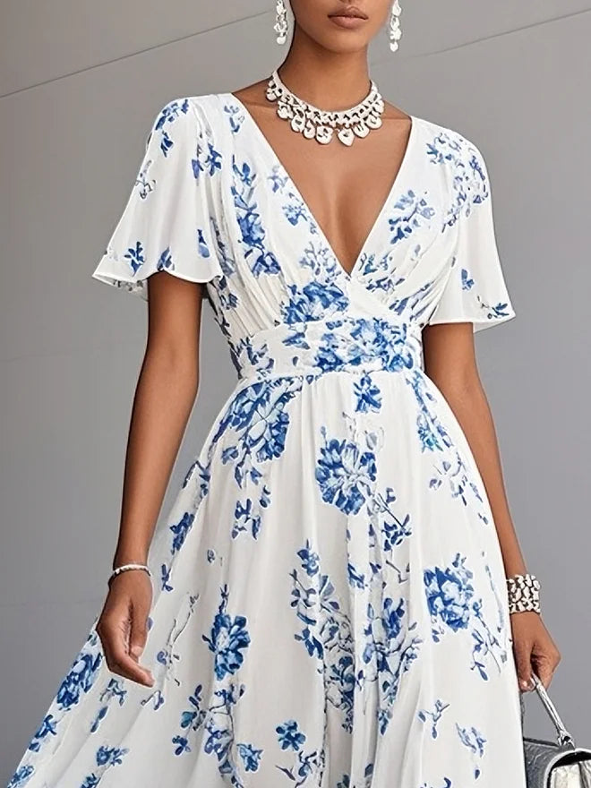 Blue Floral Chiffon V Neck Short Sleeve A-Line Maxi Dress
