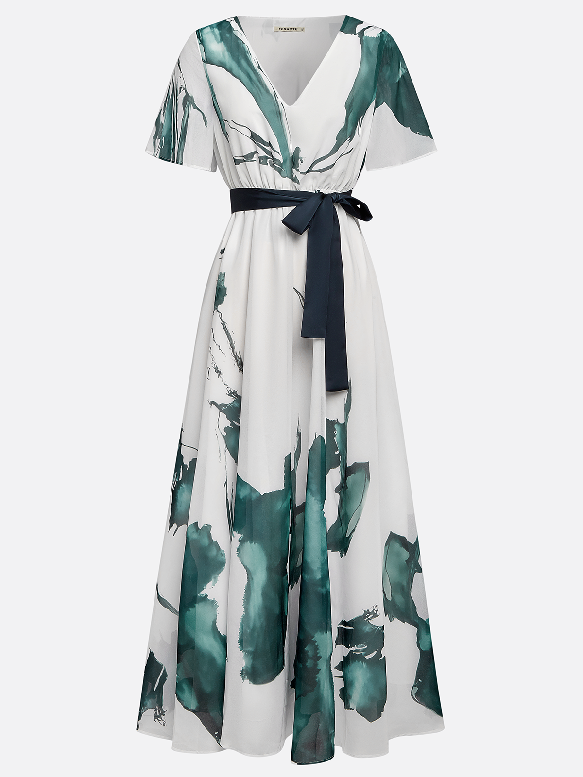 Blue Printing Chiffon V Neck Short Sleeve A-Line Maxi Dress With Belt