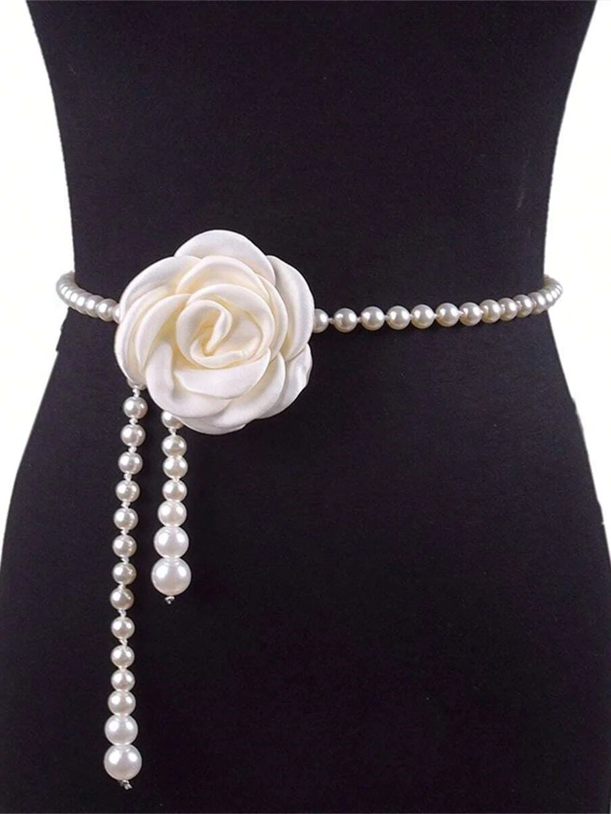 Elegant Camellia Flower Waist Chain Faux Pearls Necklace