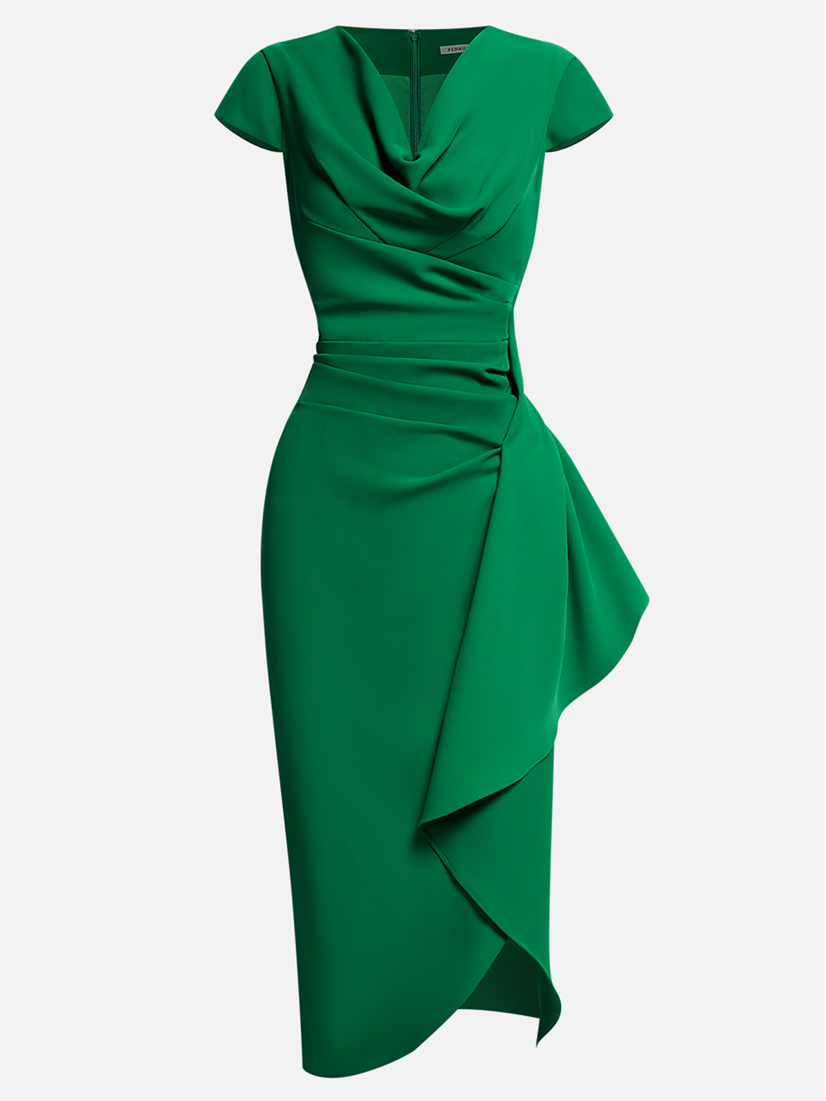 Green Cowl Neck Ruched Cap Sleeve Sheath Midi Dress