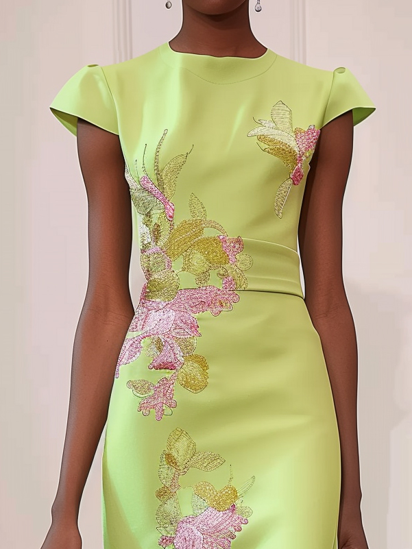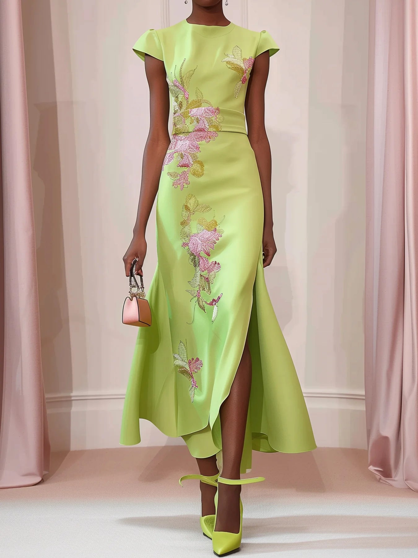 Green Satin Floral Embroidered Cap Sleeve Slit Sheath Maxi Dress