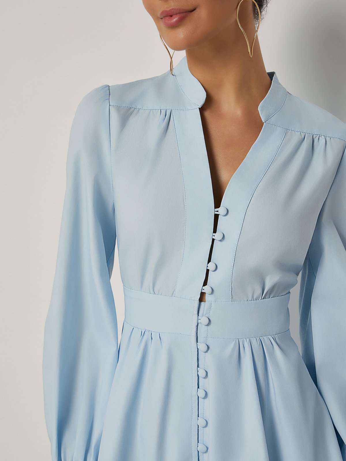 Light Blue Buckle Gathered Cotton V Neck Long Sleeve Balloon Sleeve A-Line Mini Dress