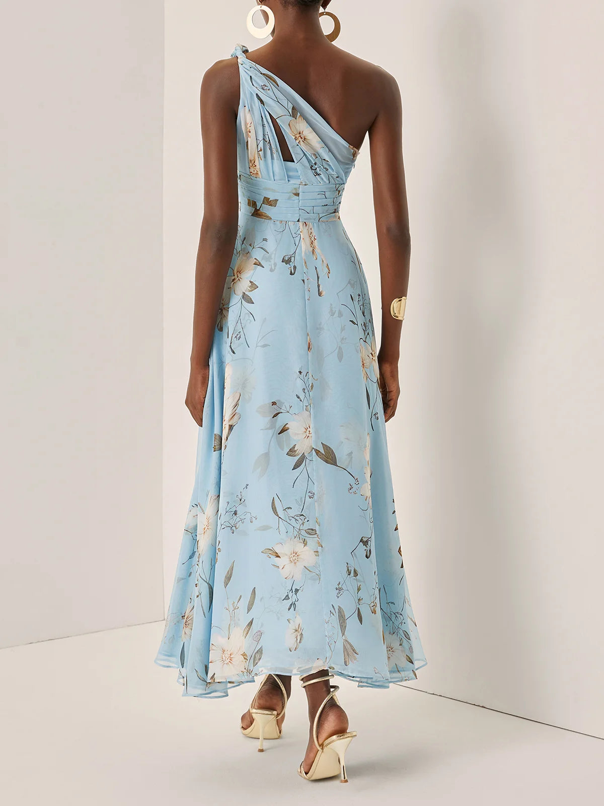 Light Blue Floral Ruched Chiffon One Shoulder Sleeveless A-Line Maxi Dress