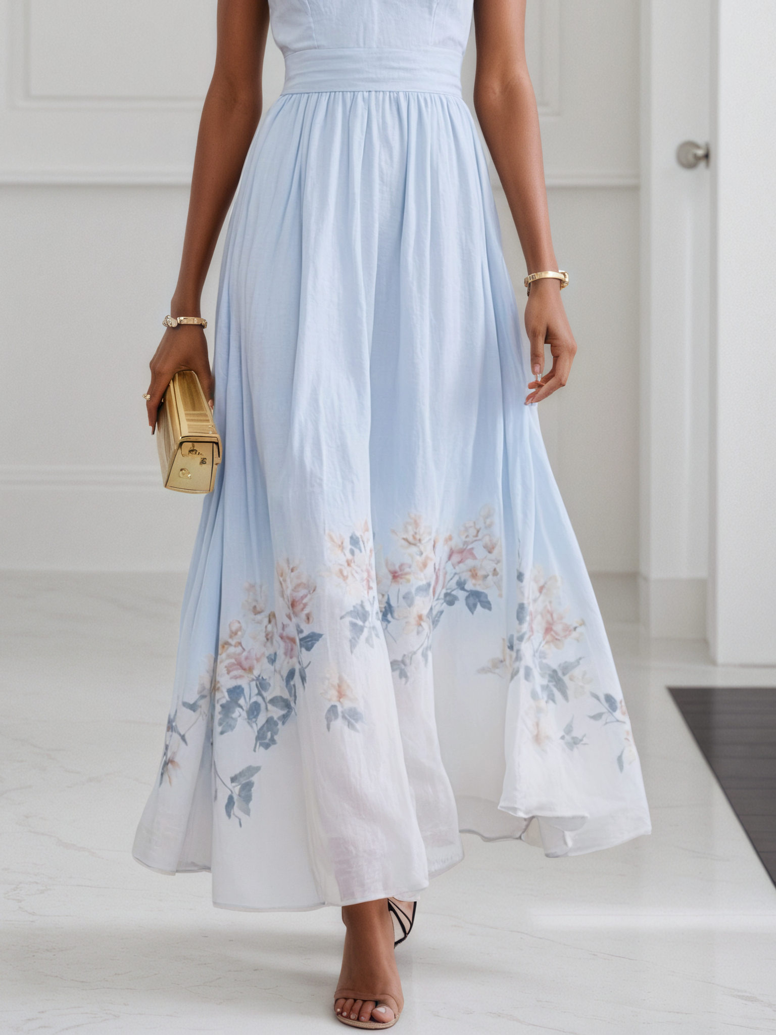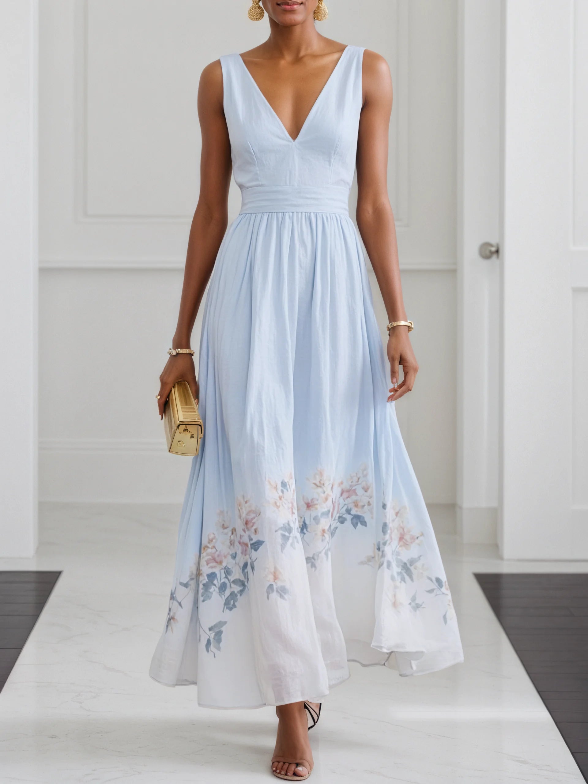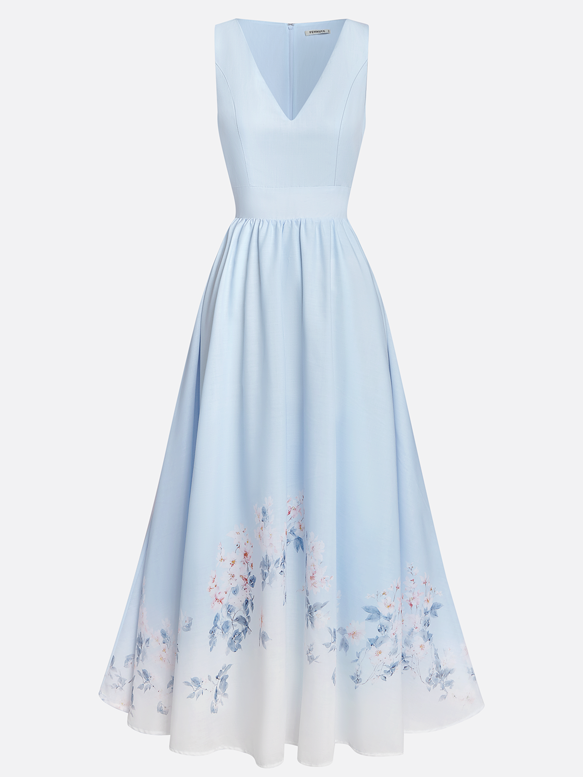 Light Blue Floral V Neck Sleeveless A-Line Maxi Dress