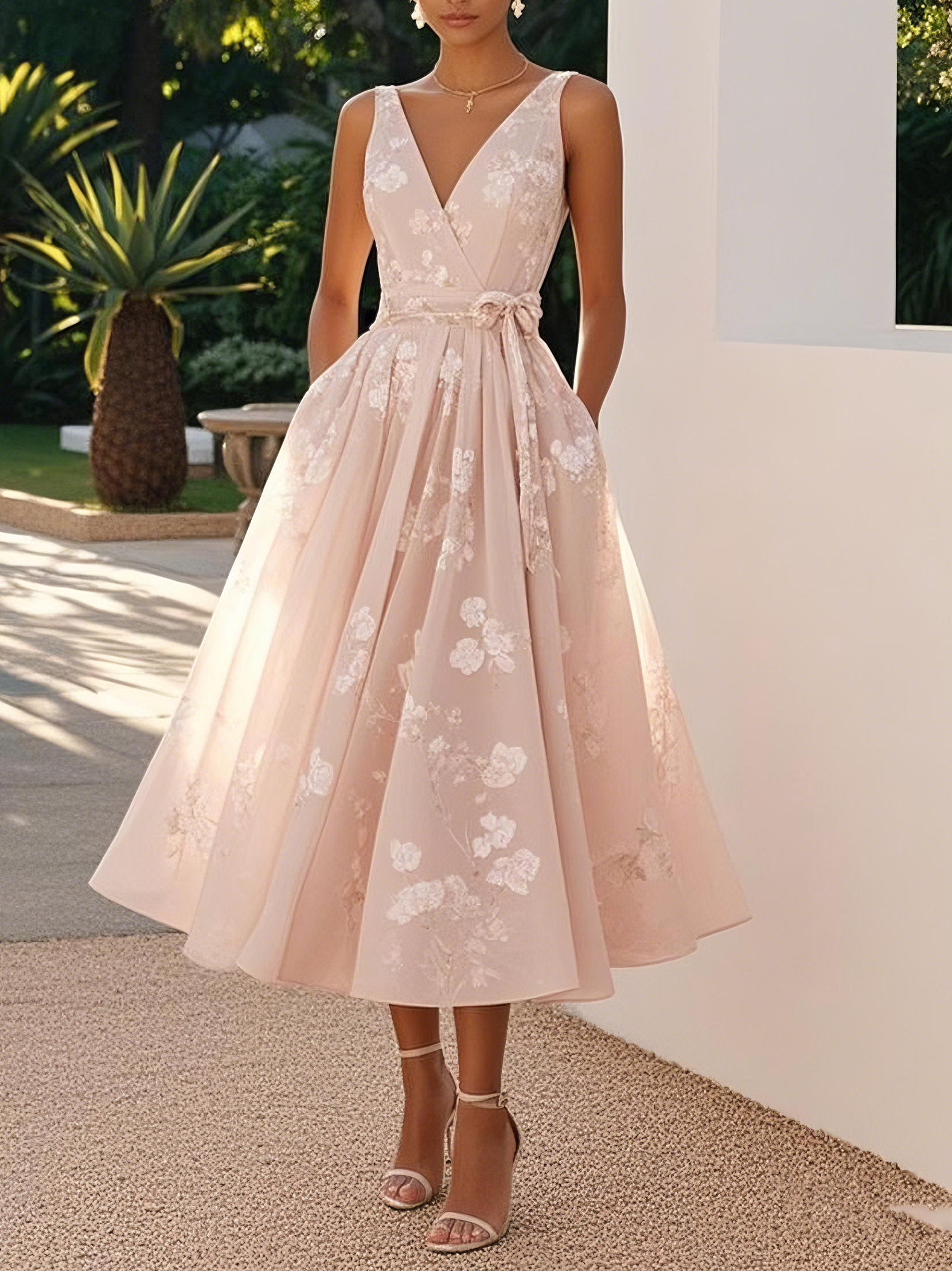 Light Pink Bow Embroidery Classic V Neck Sleeveless A-Line Midi Dress