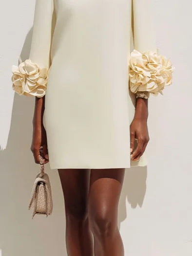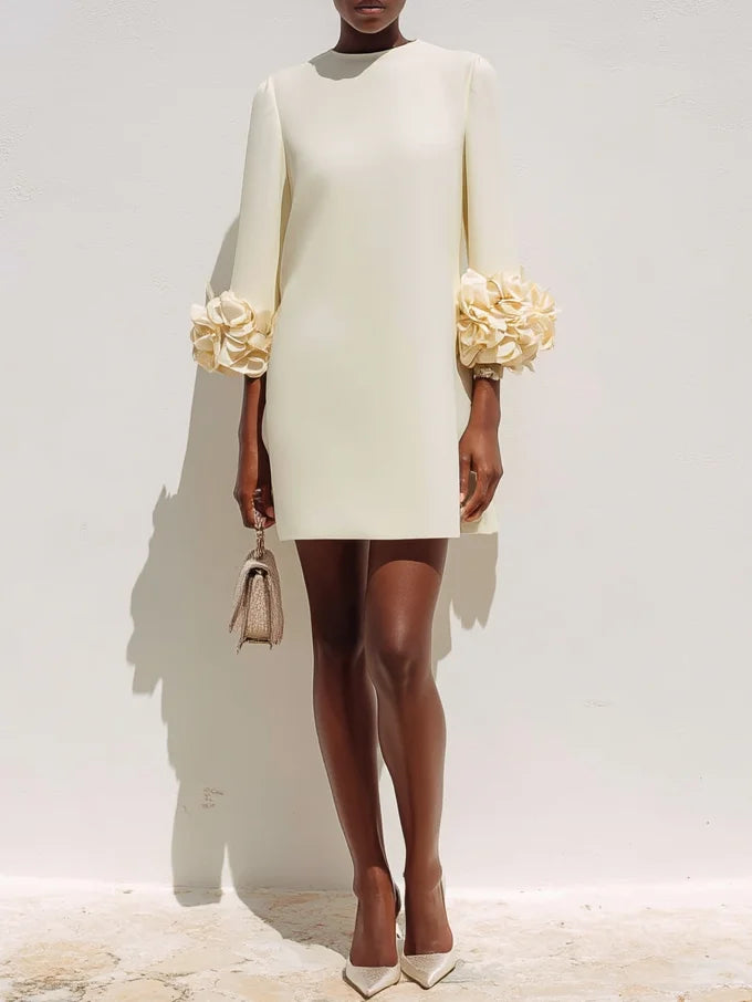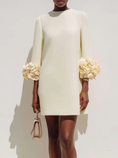 Off White 3D Floral Classic Crew Neck Three Quarter Sleeve Shift Mini Dress