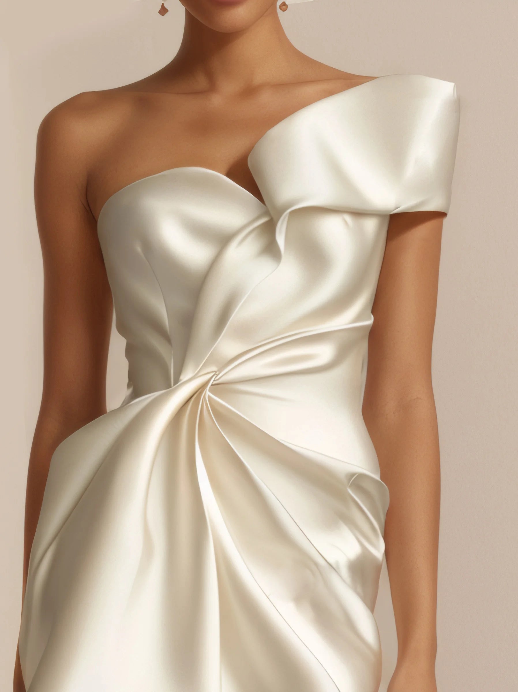 Off-White One-Shoulder Ruched Satin Sheath Mini Dress
