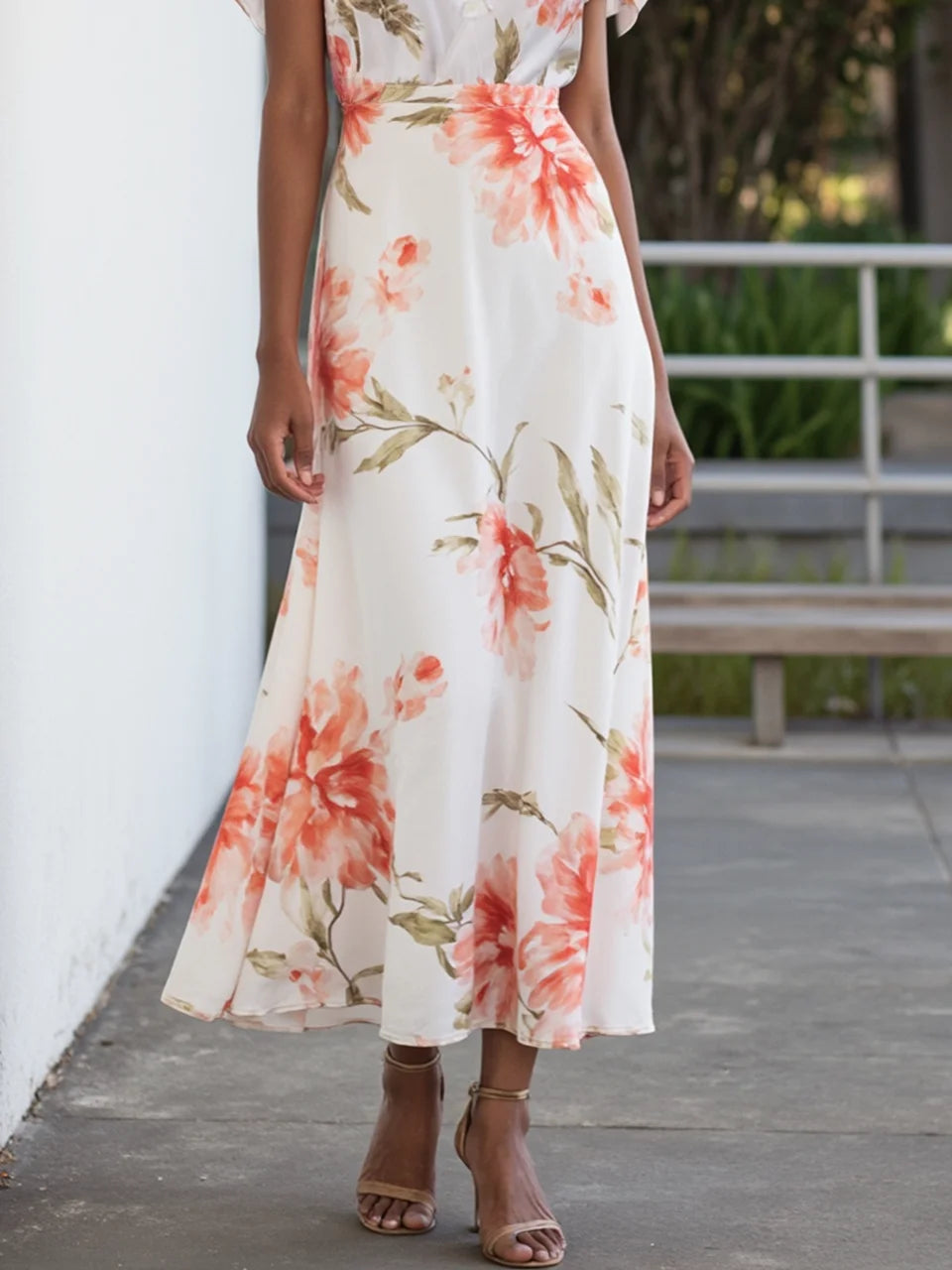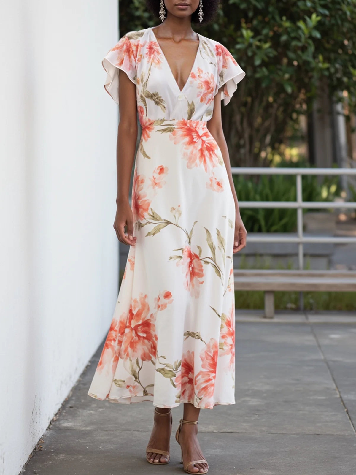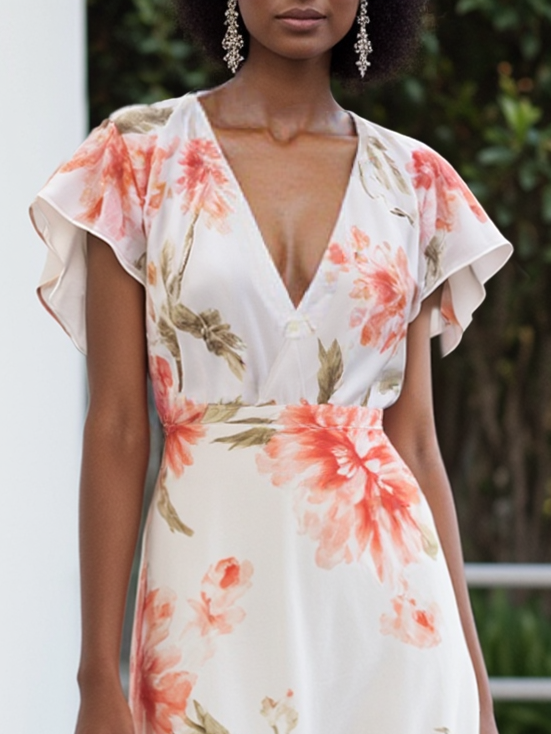 Orange Red Chiffon V Neck Short Sleeve Bell Sleeve A-Line Midi Dress
