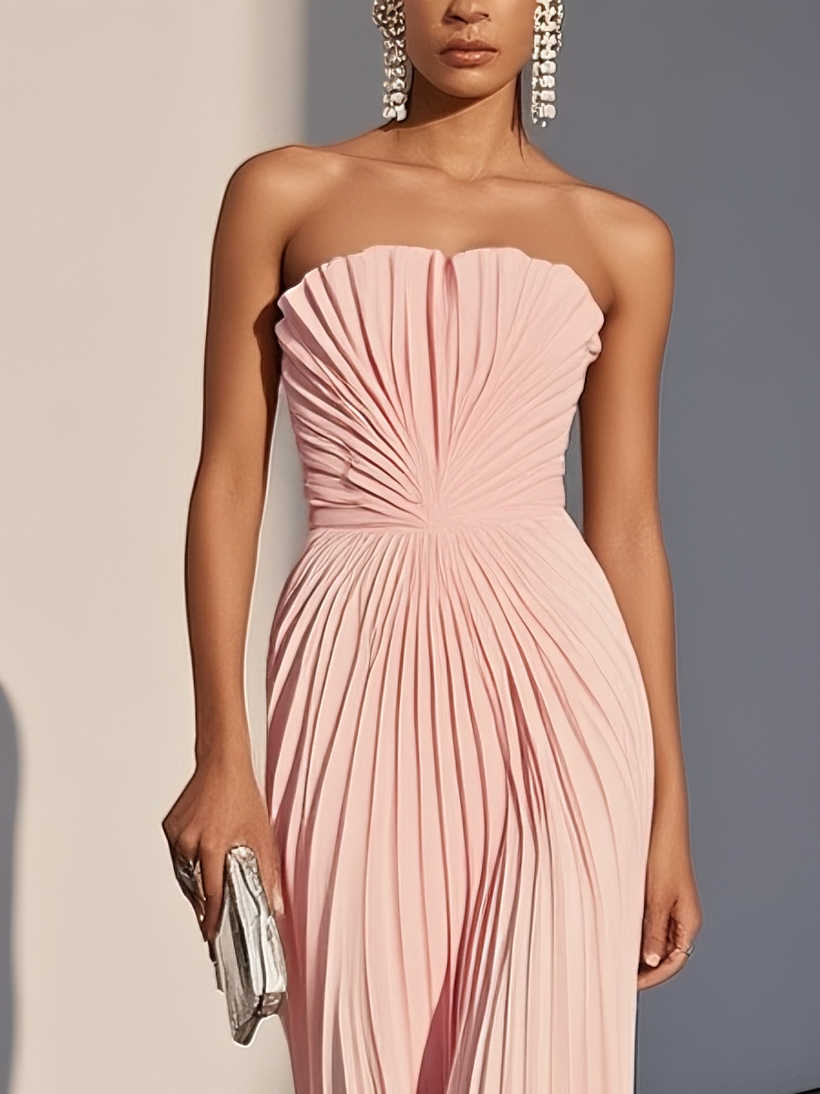 Pink Pleated Classic Strapless Sleeveless A-Line Maxi Dress