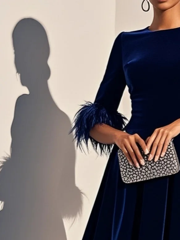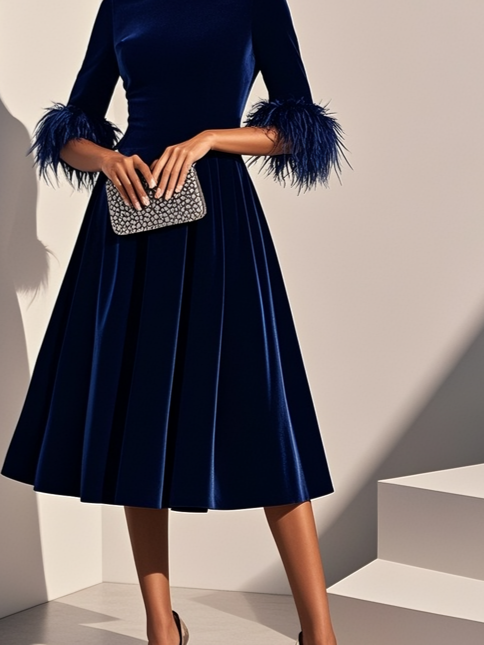 Purplish blue Feather-trimmed Velvet Crew Neck Half Sleeve A-Line Midi Dress