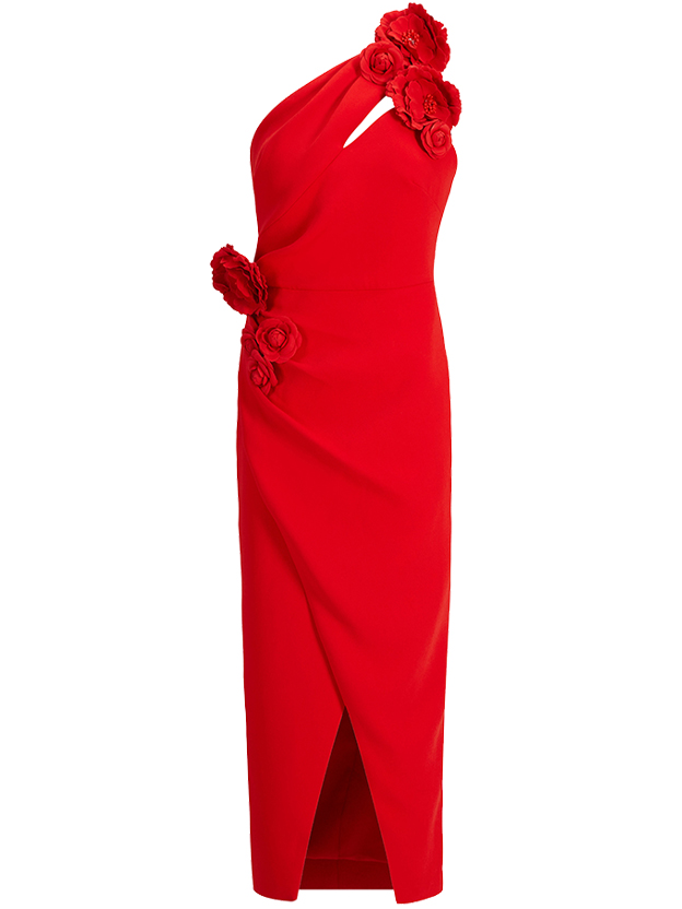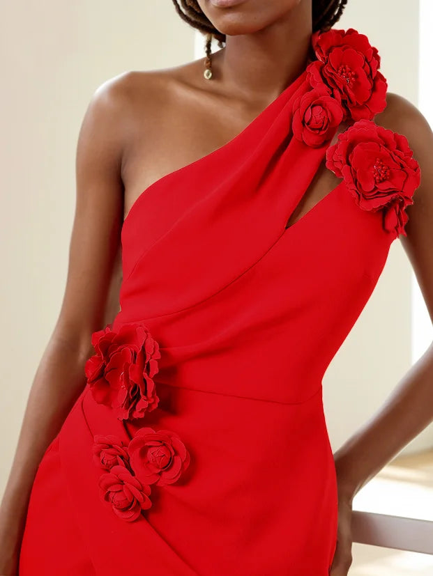 Red 3D Floral One-Shoulder Sheath Midi Dress