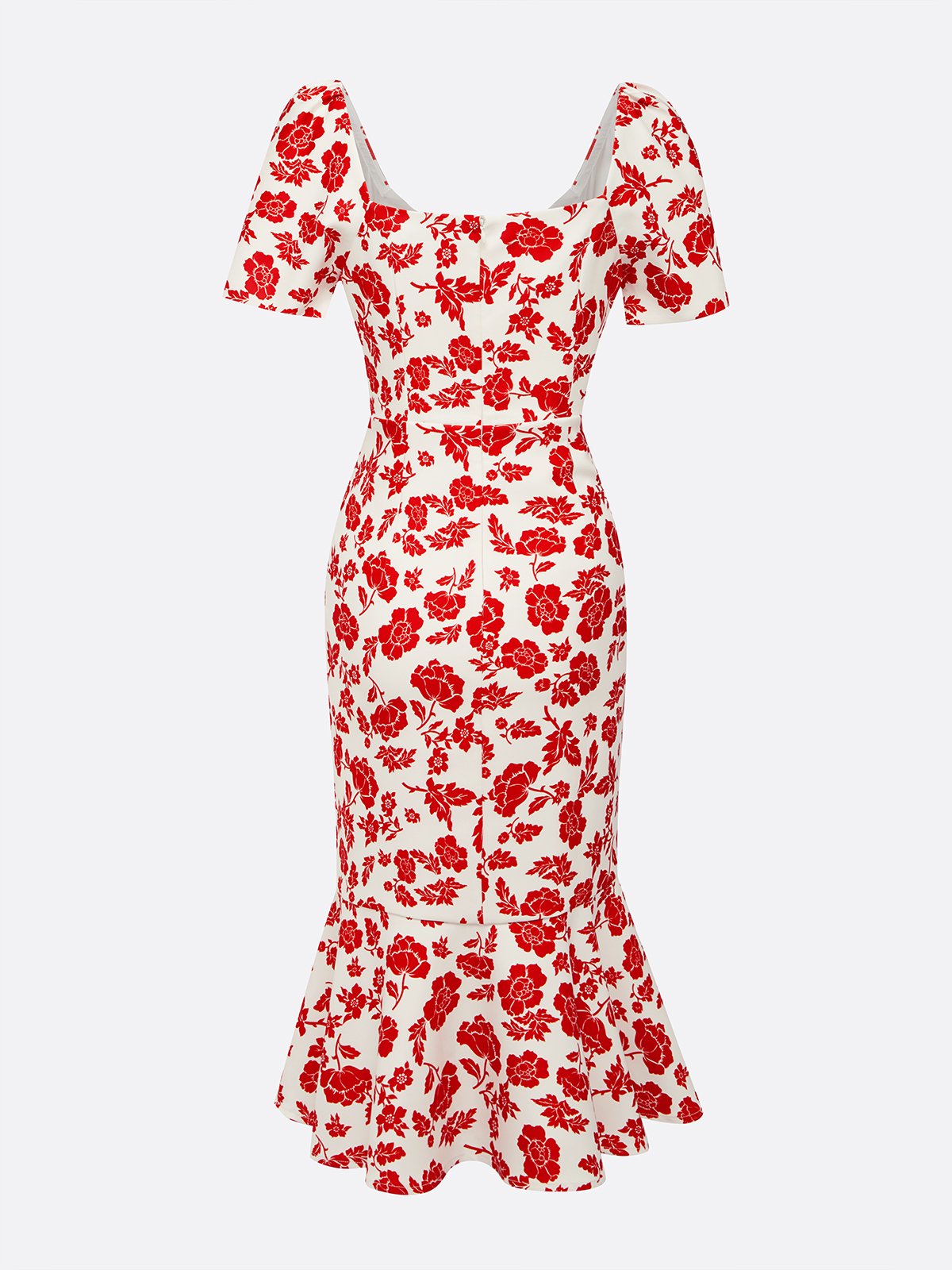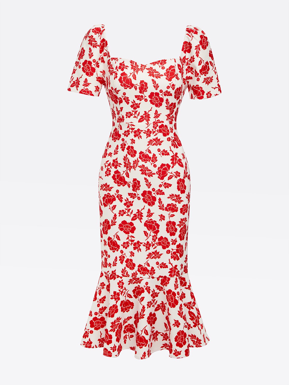 Red Floral Sweetheart Neckline Mermaid Midi Dress