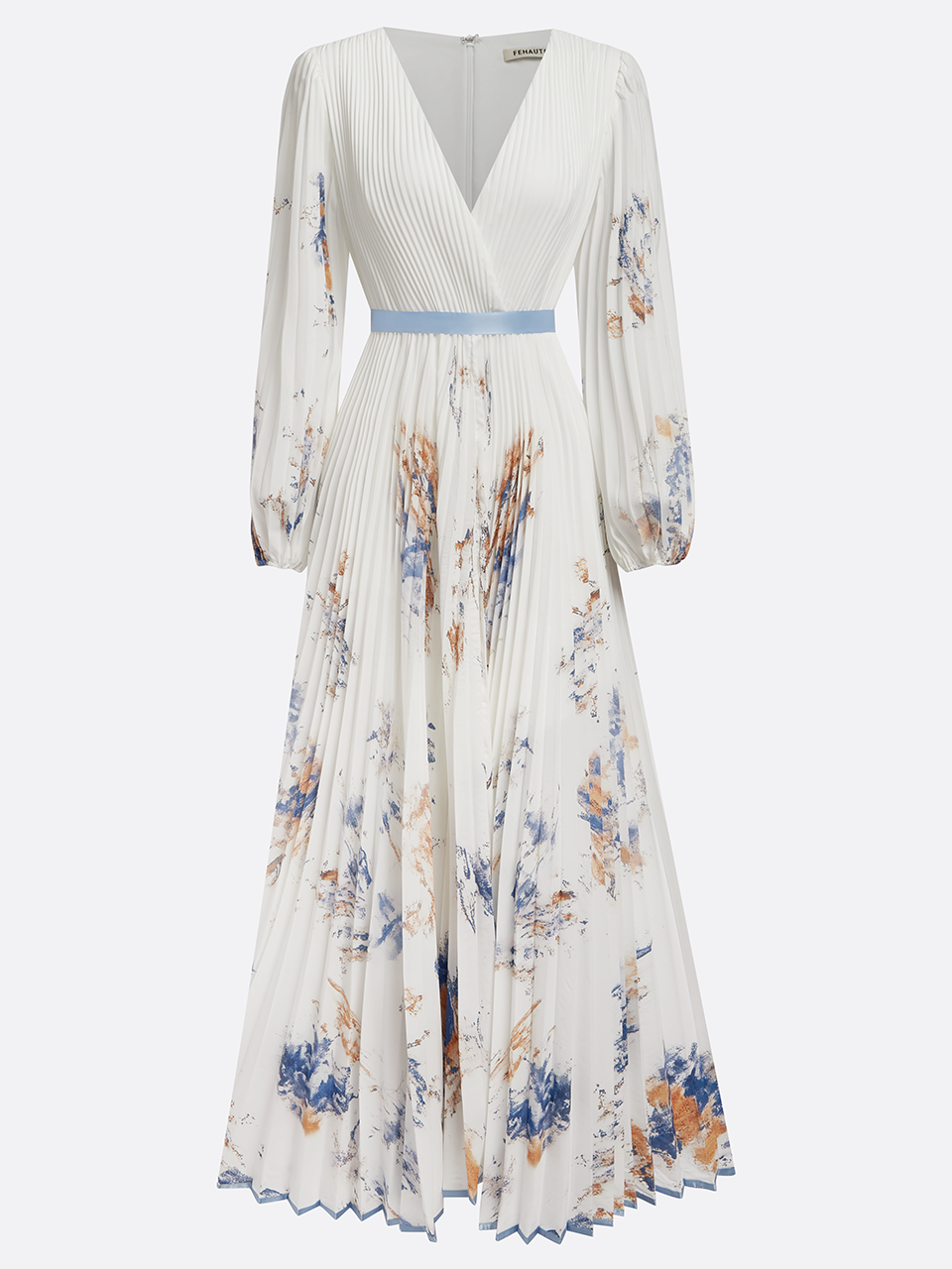 White Pleated Floral Chiffon V Neck Long Sleeve Balloon Sleeve A-Line Maxi Dress