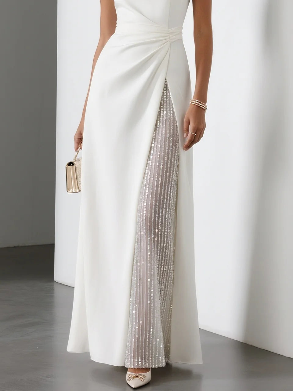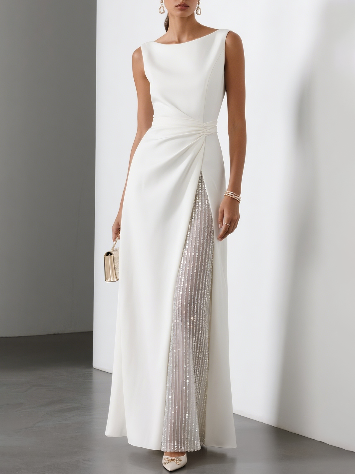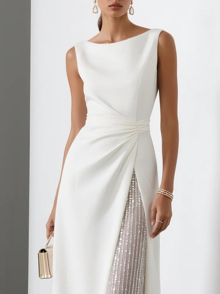 White Sequin Ruched Classic Sleeveless A-Line Midi Dress