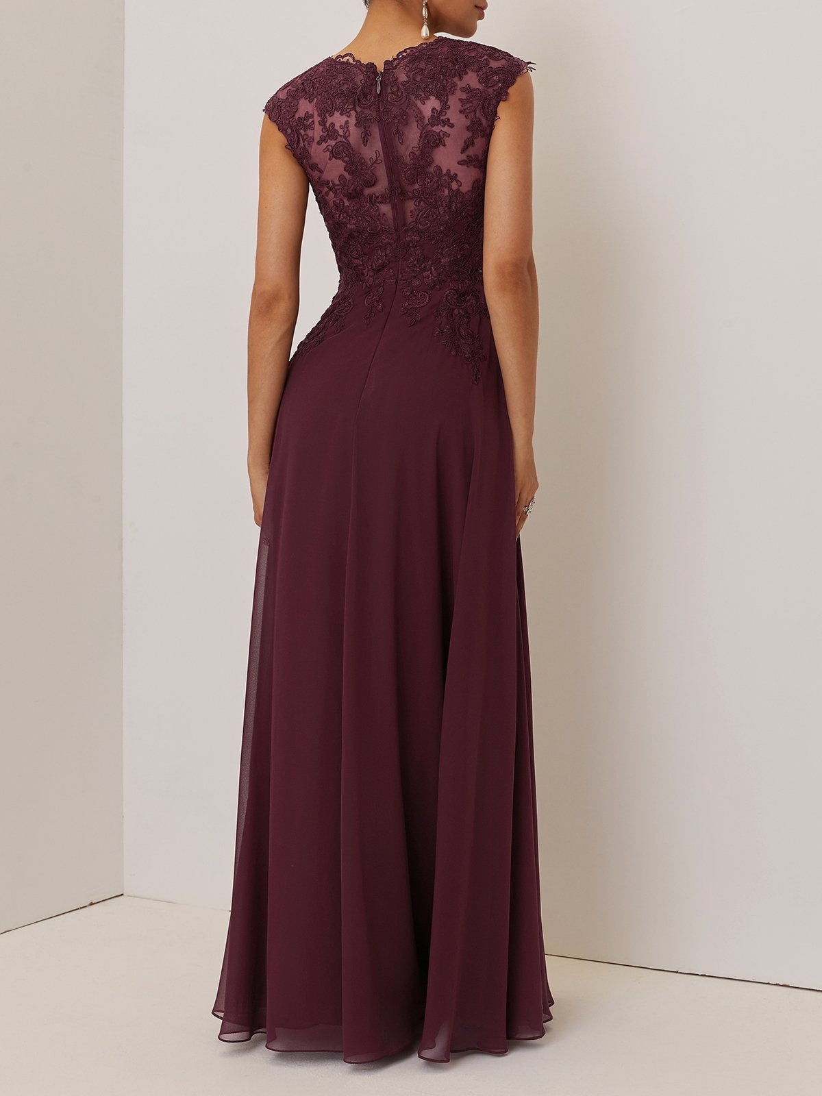Wine Red Lace Chiffon Crew Neck Cap Sleeve A-Line Maxi Mother of the Bride or Groom Dress