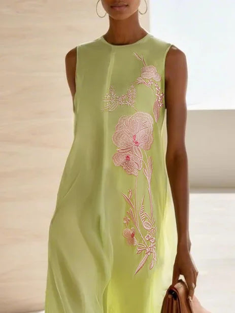 Yellow Embroidery Classic Lyocell Crew Neck Sleeveless A-Line Maxi Dress
